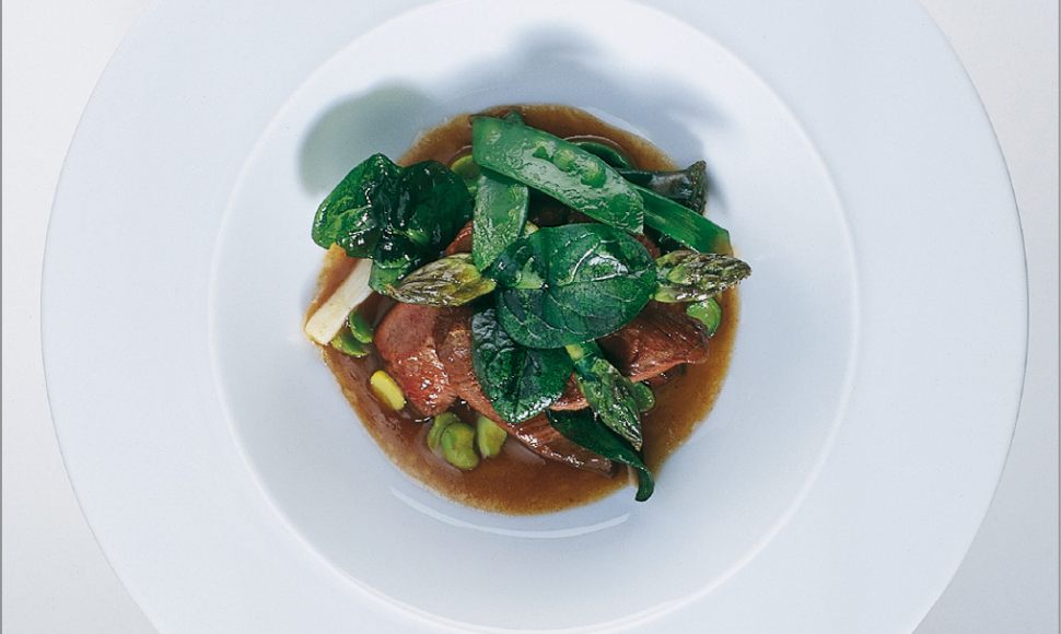 Sauté d’agneau de lait minute, légumes de printemps, févettes, pois gourmands