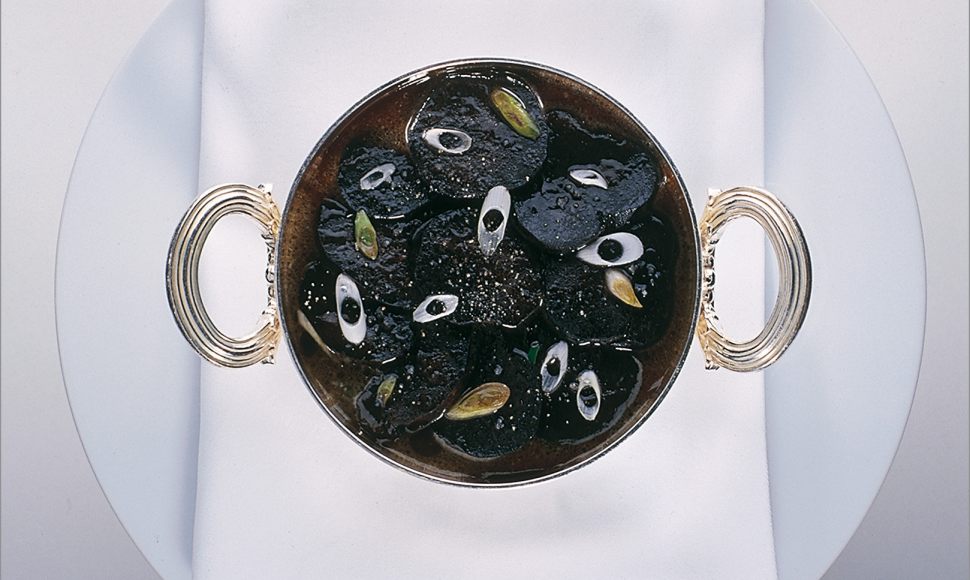 Nettoyer les truffes sous l’eau froide courante à l’aide d’une brosse à ongles. Les essuyer, les éplucher avec un couteau à lame fine (garder les parures pour une autre préparation) et les tailler en lamelles de belle épaisseur.