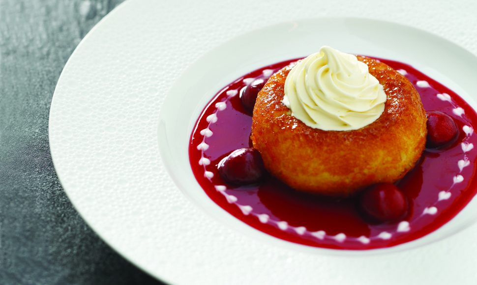 "Retrouver l'essence du produit est souvent synonyme de rechercher un goût enfoui dans les souvenirs. Les cerises me ramènent à mon enfance, lorsqu'elles ornaient mes oreilles. Elles me rappellent mes premières convoitises, mes premiers plaisirs. Qui ne rêve pas de réussir au moins une fois un splendide dessert qui arrache à ses convives des cris d'enthousiasme ? En voici un, plus facile à réaliser qu'il n'y paraît. Ce dessert est un vrai feu d'artifice, de saveurs et de couleurs. Son lustrage à la confiture lui donne une touche finale très classe."