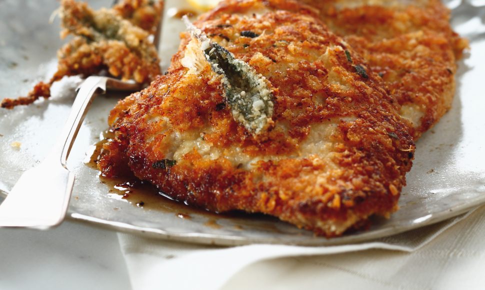 Dans une assiette creuse, fouettez les œufs avec du sel et du poivre. Lavez et séchez les feuilles de sauge. Mixez-les avec le parmesan, ajoutez la chapelure, mixez à nouveau et versez le tout dans une autre assiette creuse. Passez les scalopines dans l'œuf battu, puis dans le mélange chapelure-parmesan. Recommencez et réservez.