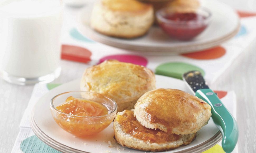 Farinez légèrement un plan de travail et étalez la pâte à scones sur une épaisseur de 1 cm à l’aide d’un rouleau à pâtisserie. À l’aide d’un emporte-pièce ou d’un verre retourné, détaillez des cercles de 5 cm de diamètre, puis déposez-les sur une plaque recouverte de papier cuisson. Badigeonnez les scones de lait avec un pinceau. Enfournez et faites cuire pendant 10 à 15 min environ, jusqu’à ce que les scones soient gonflés et blonds. À la fin de la cuisson, retirez-les de la plaque de cuisson et laissez-les tiédir sur une grille.