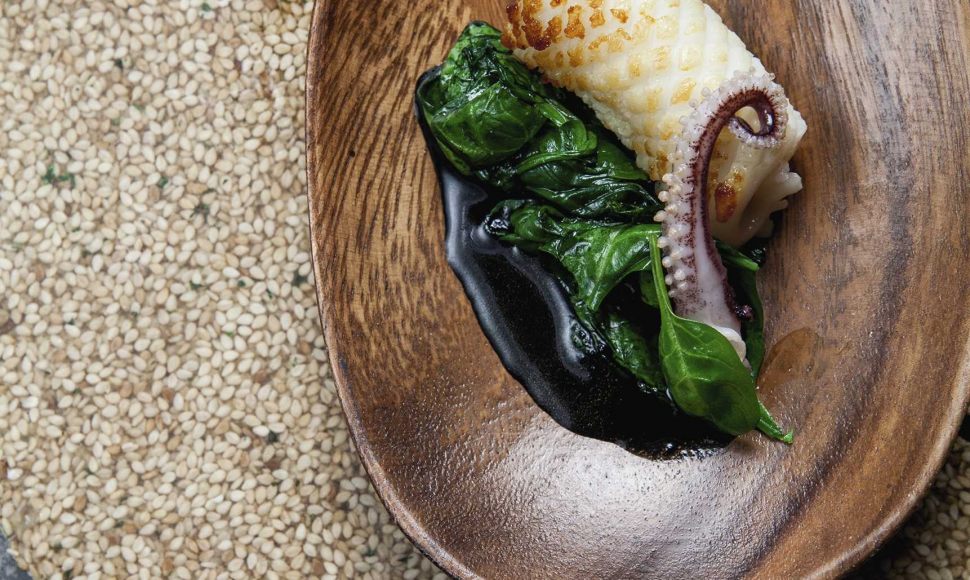 Une recette traditionnelle de Paros qui met à l'honneur la seiche, accompagnée d'épinards sautés et d'un jus d'encre de seiche savoureux.