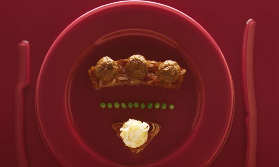 Il s’agit d’un plat typiquement catalan, mêlant les ingrédients d’origine terrienne et marine, ce qui s’appelle « mar i mantanya ». Dans la « Sepia amb mandoguilles », ces mandoguilles sont frites puis ajoutées dans la cuisson de la seiche en dés avec les petits pois et une picada d’amandes. Nous avons gardé tous les ingrédients mais en les cuisinant différemment.