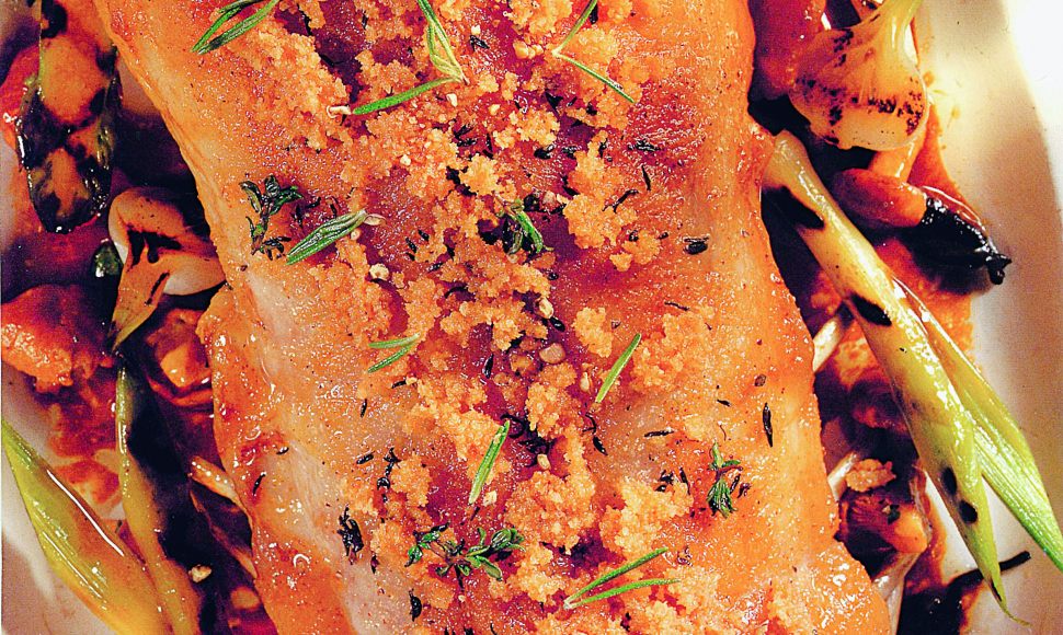 Selle d'agneau de lait rôtie avec ses rognons, légumes grillés
