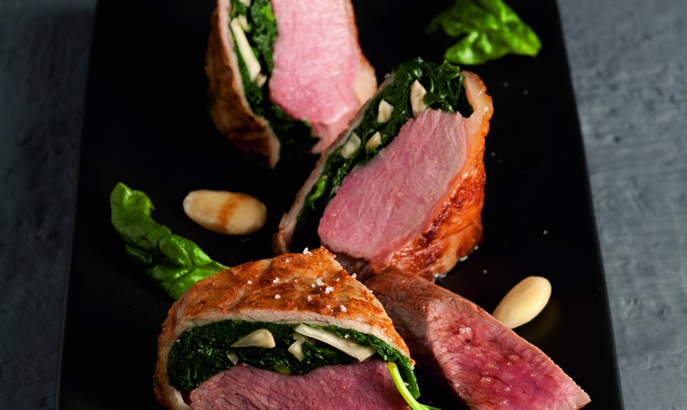 Selle d’agneau rôtie farcie aux épinards et amandes