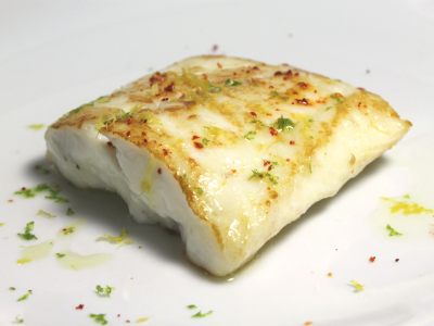 Chauffer doucement la poêle avec un peu d'huile d'olive et y déposer le pavé de turbot. Retourner le poisson au bout de quelques minutes, une fois qu'il est légèrement coloré. Le cuire sur toutes les faces puis le débarrasser sur une assiette de présentation. Zester un peu de citron vert et jaune sur le poisson. Assaisonner de fleur de sel et de piment d'Espelette puis servir.