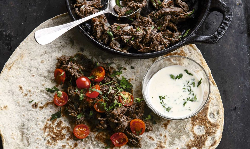 Ouvrez un pain manouché ou pita plat sur le plan de travail et étalez-y uniformément la viande chaude bien égouttée. Par-dessus, étalez successivement la sauce tarator, les tomates cerises et le mélange persil-oignon.