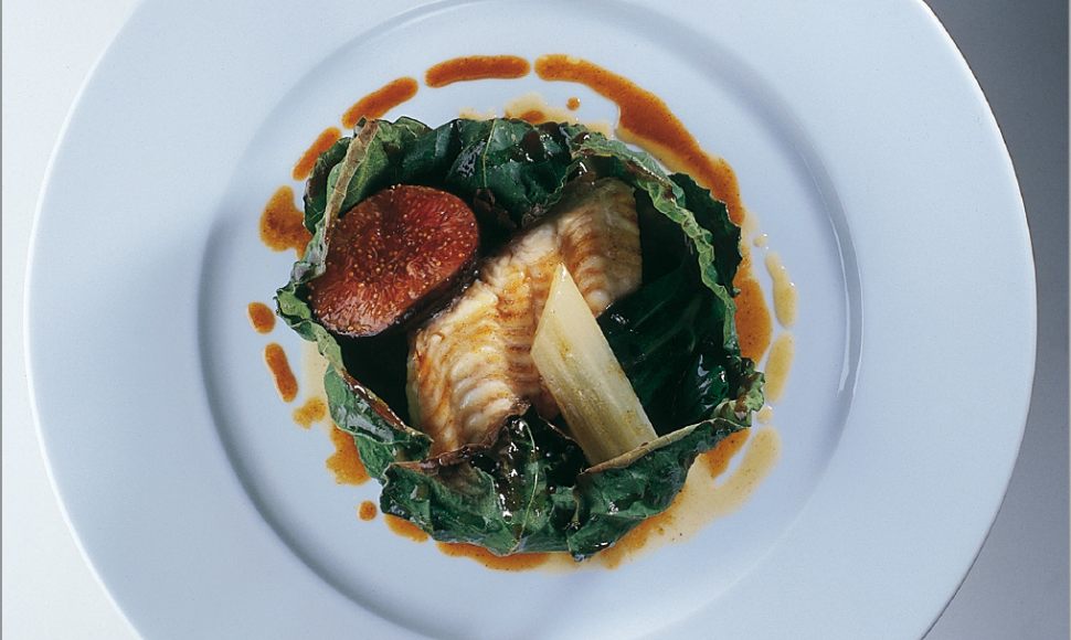 Sole côtière cuite en feuilles de figuier, sauce dolce forte, tombée de vert de blette, grosses côtes braisées
