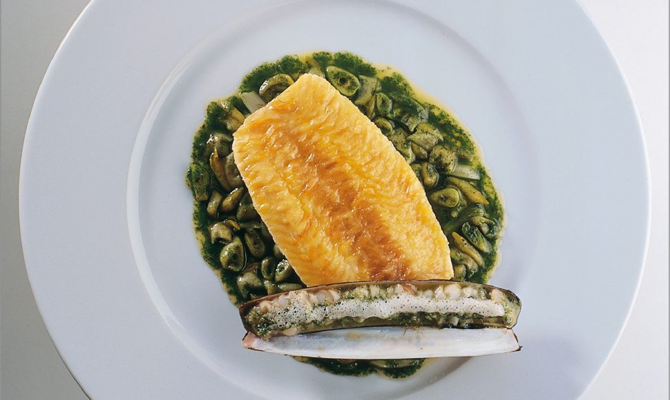 Sole de noirmoutier dorée au beurre demi-sel, coquillages au vert