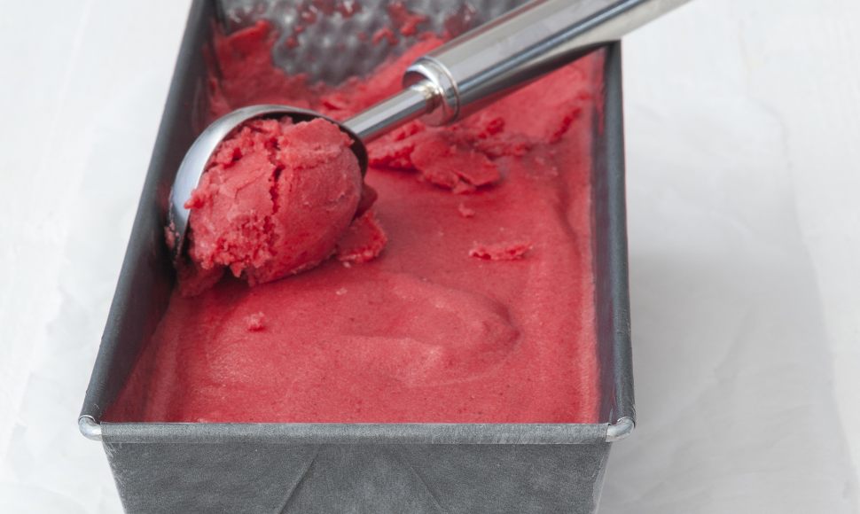 Si vous n'avez pas de sorbetière, pas de panique ! Il suffit de préparer un sirop simple en chauffant du sucre et de l'eau. Ensuite, mixer des framboises fraîches ou surgelées et le sirop à l'aide d'un blender. Placez au congélateur durant plusieurs heures.