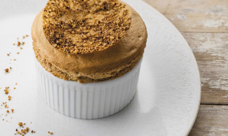 À travers ce soufflé, j'ai souhaité retranscrire la rencontre entre le chef et le producteur de Cazette®, un produit original et typique de Bourgogne. Il nous permet de retrouver le goût typé de la noisette, mais de manière plus marquée. C'est cela qui confère à ce dessert toute sa gourmandise...