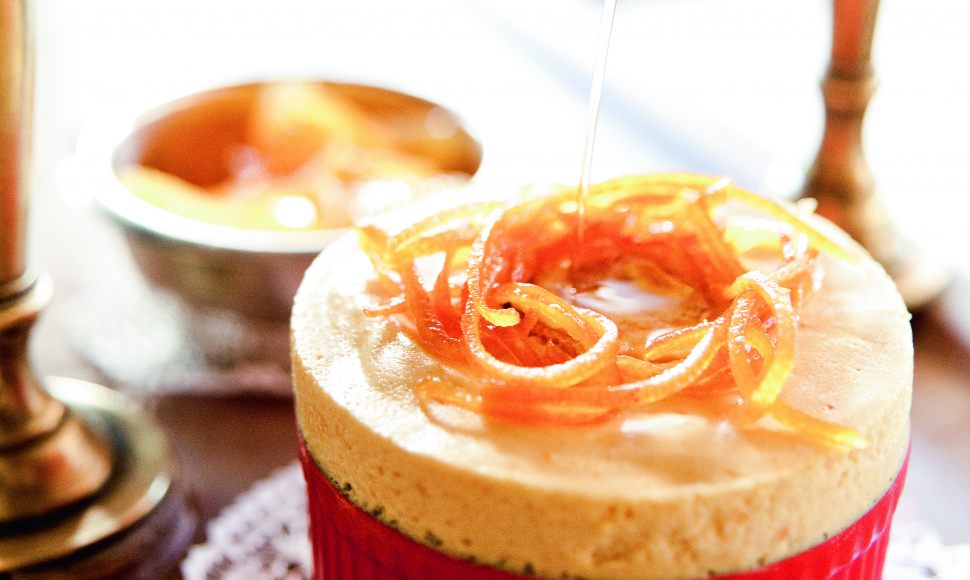 Versez l’appareil à soufflé à hauteur dans des ramequins. Insérez un tube en plastique au centre, réservez au congélateur et laissez prendre 4 h au moins. Étalez de la marmelade sur le biscuit, taillez des bandes de 10 cm, puis roulez-les. Une fois le soufflé bien glacé, retirez délicatement le tube et remplacez-le par un biscuit roulé de même hauteur, puis disposez délicatement un peu de julienne de zestes d’orange au sommet du soufflé. Versez un trait de cointreau et posez quelques suprêmes. Servez le reste des zestes confits et des suprêmes à part.