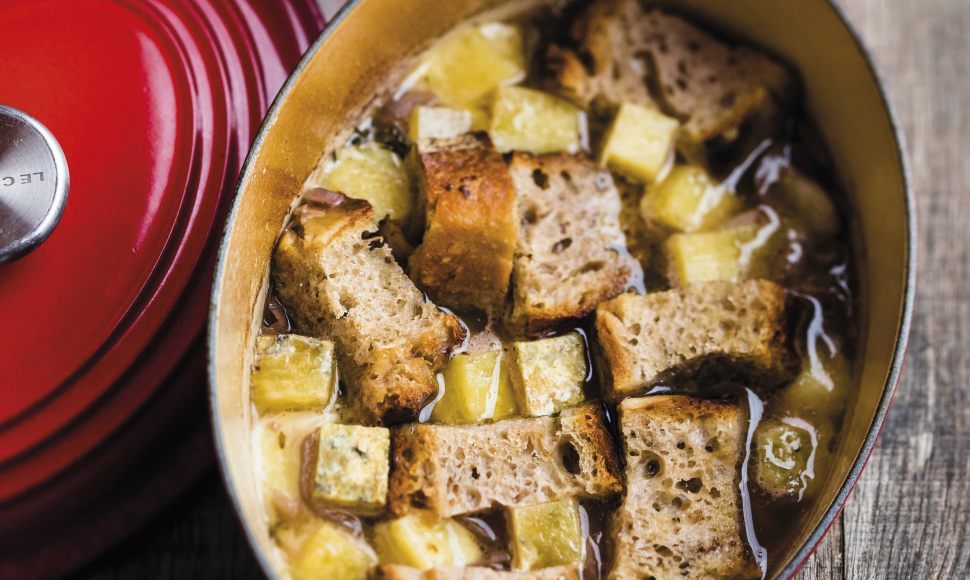 Épluchez et émincez les oignons. Faites-les suer dans le beurre jusqu’à ce qu’ils soient légèrement roux. Ajoutez les gousses d’ail en chemise* éclatées avec la main, le thym et le laurier.