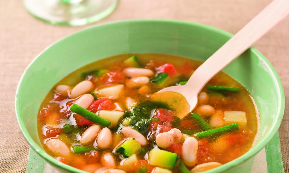 Mettez du soleil dans vos assiettes avec la soupe au pistou d'Alain Ducasse. D'origine gênoise, ce plat aux mille saveurs se consomme traditionnellement en Provence. À base de petits haricots blancs secs, de pommes de terre, de courgettes, de haricots verts, de tomates et d'oignons, cette recette allie parfums du jardin et générosité. Servez-la en entrée ou en plat principal, accompagnée d'un pistou composé d'ail, de parmesan, de pignons de pain et de basilic. Un délice.
