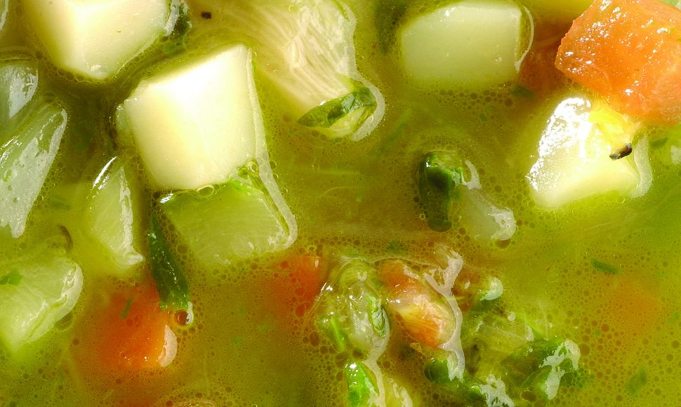 Éplucher, laver et essuyer les pommes de terre, les courgettes ; équeuter les haricots verts et les débiter en dés. Écosser les haricots cocos. Éplucher l’ail et les oignons et les hacher. Couper en dés les courgettes, les pommes de terre. La découpe de tous les légumes doit être uniforme. Réserver tous les légumes.
