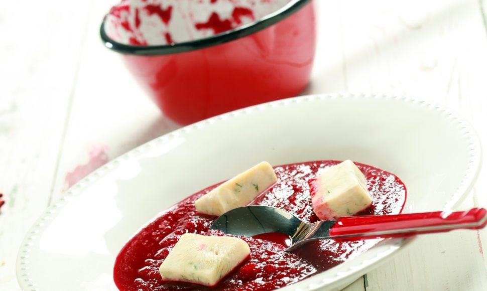 Une entrée aux notes ultra-fraîches grâce à une soupe de betteraves à la crème et des glaçons de yaourt au paprika et à l'aneth.