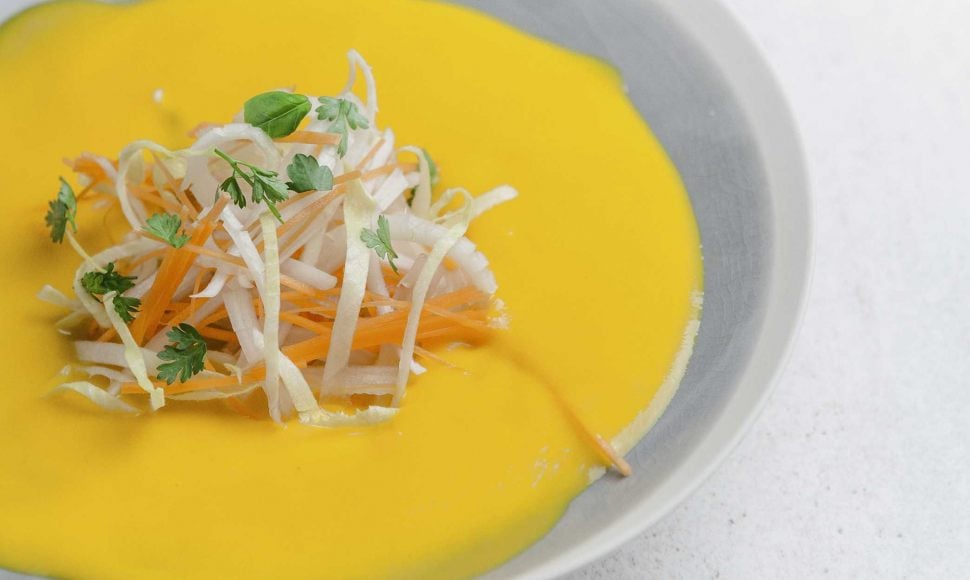 Une soupe qui associe fruits et légumes pour un jeu entre le sucré et le salé, relevée par différentes herbes et épices.