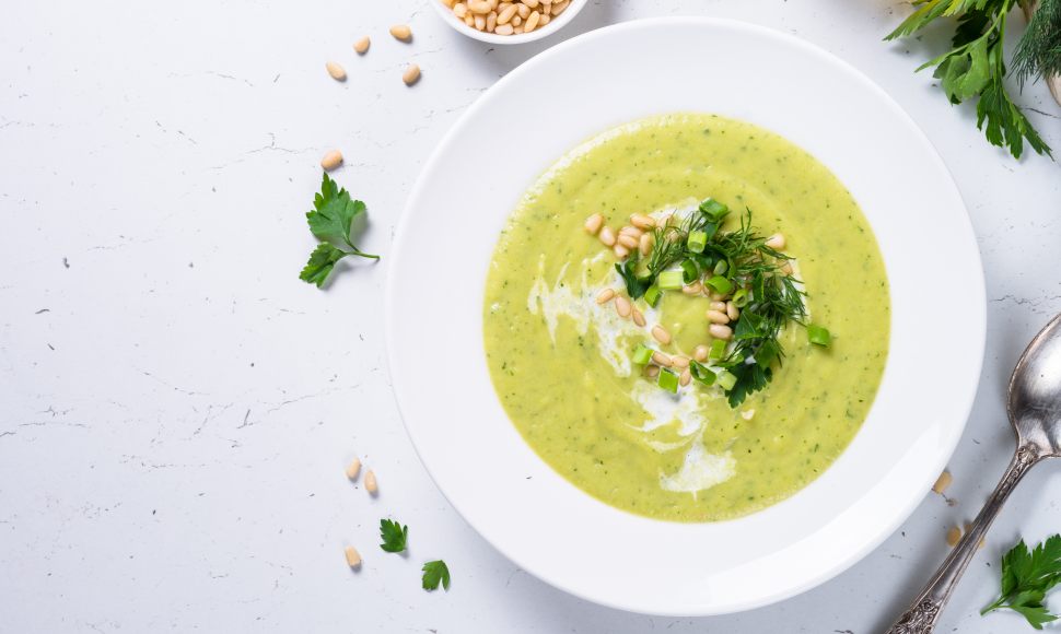 Une soupe de courgettes et mozzarella aux noix, ail et oignon à manger chaude ou froide.