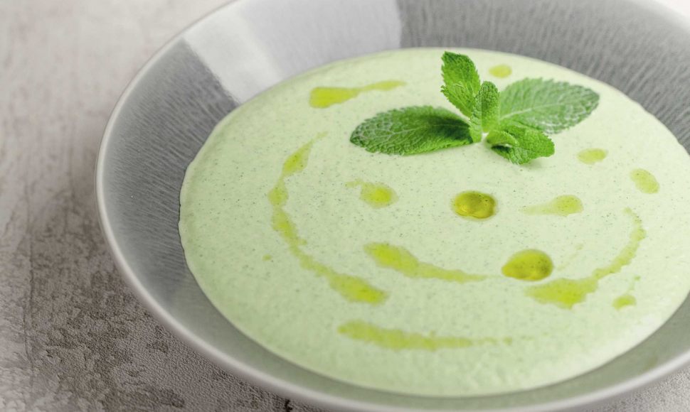 Un velouté onctueux de courgettes au lait d'amande, égayé par une pointe d'ail et de menthe.