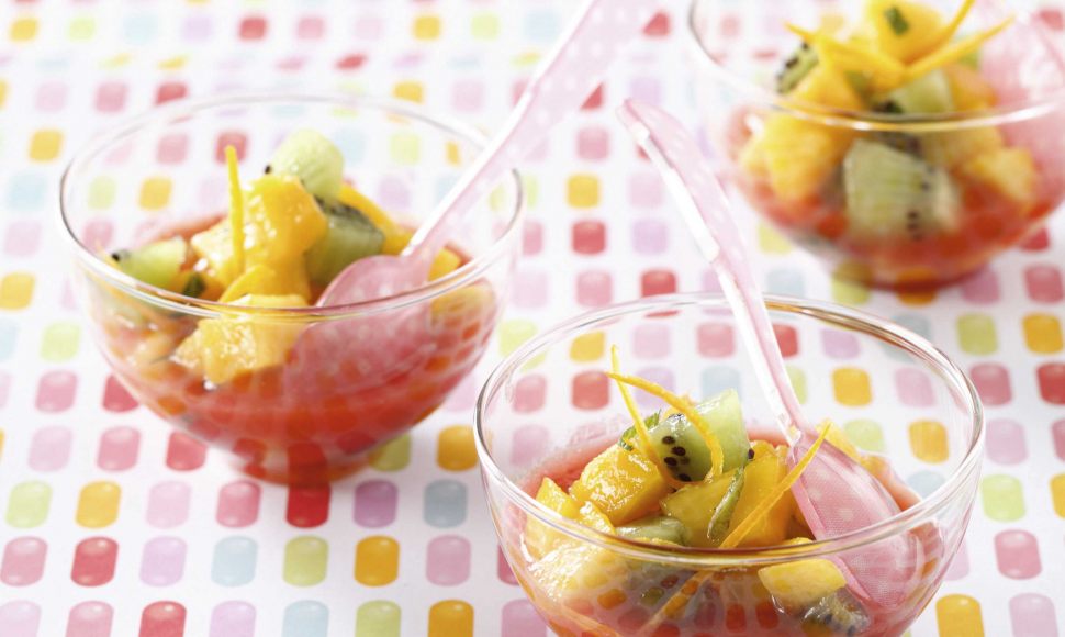 Pressez les oranges et le citron afin d’en extraire le jus. Lavez les fraises, équeutez-les et coupez-les en quatre. Épluchez les kiwis et détaillez-les en dés. Épluchez les pêches, ôtez les noyaux et détaillez-les en dés. Lavez et effeuillez le bouquet de menthe.