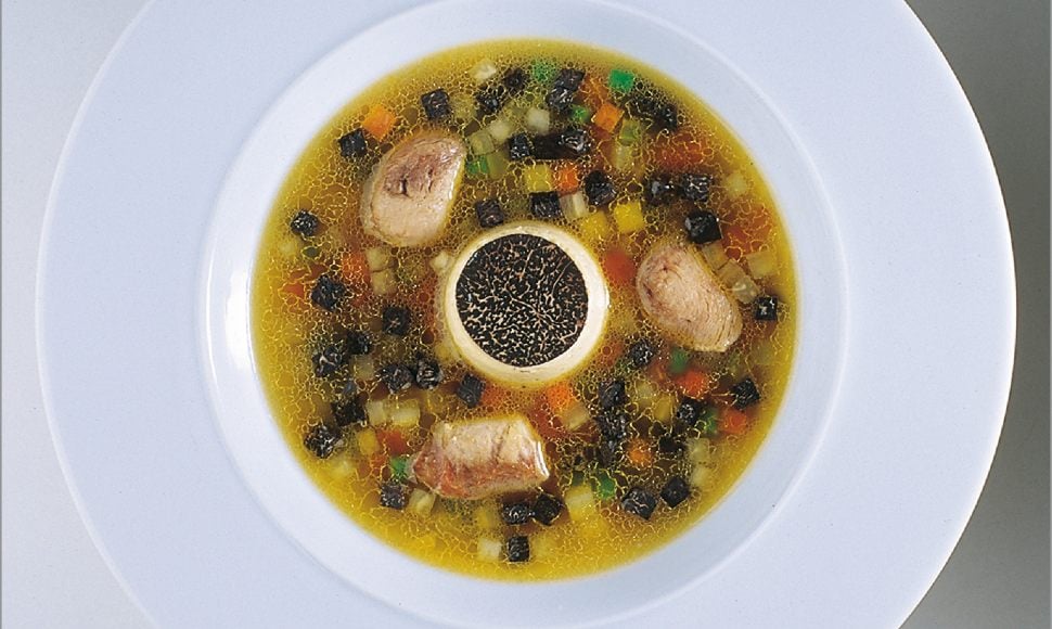 Soupe de légumes de provence aux truffes noires, royale de foies blonds et sot-l’y-laisse de volaille