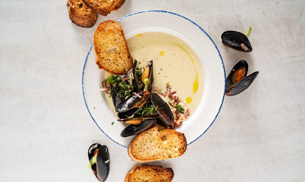 Ajoutez-y le bouillon de volaille et la moitié des moules environ. Mixez jusqu’à ce que la soupe soit lisse. Ajoutez la crème et le persil. Assaisonnez.