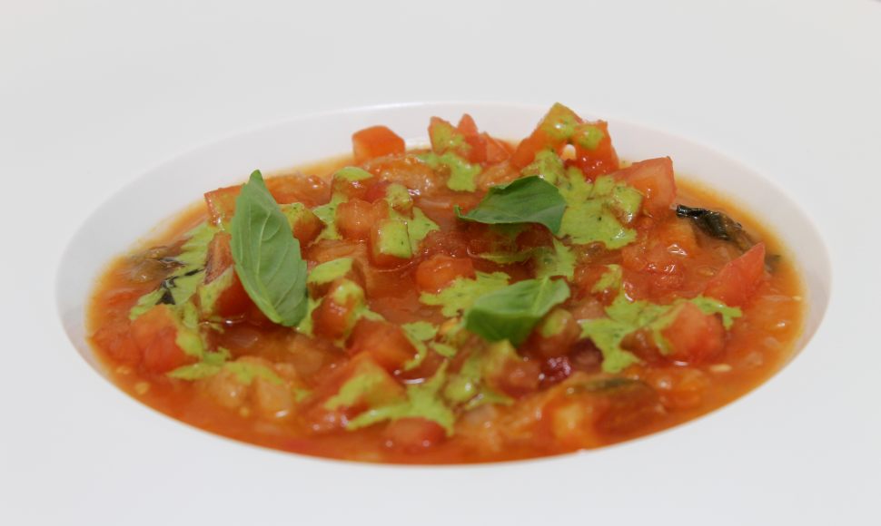 La soupe froide de tomate est revisitée dans une version plus copieuse et gourmande. Agrémentée d'un peu de pistou et de pain de campagne, cette recette parfumée ne manquera pas de vous régaler.