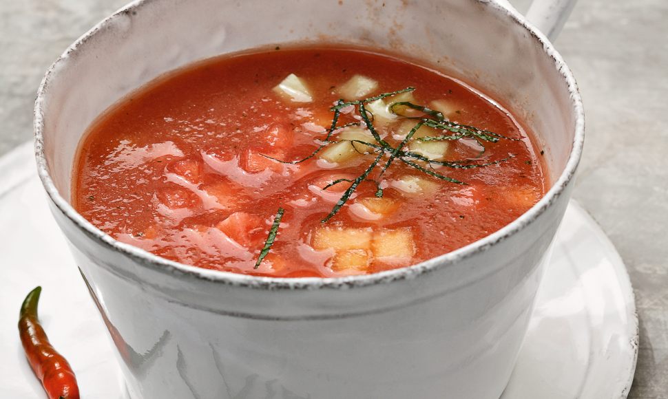 En pleine saison des pastèques et des melons, réalisez cette soupe froide de fruits, parfumée au gingembre, à l'eau de fleur d'oranger et au piment. Pour une dernière touche de fraîcheur, ajouter la menthe et la coriandre hachées.