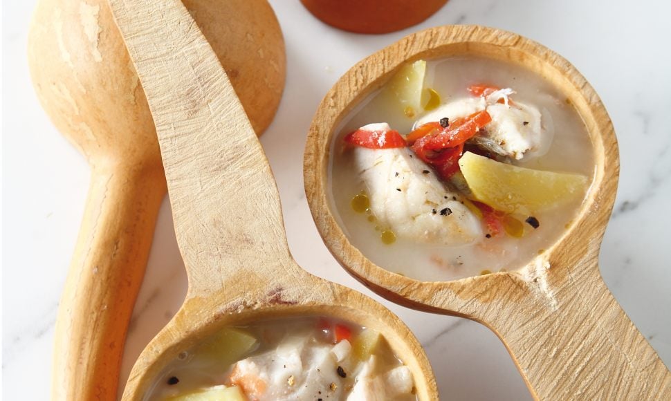 "J’ai dégusté cette soupe dans un petit village de pêcheurs en Afrique du Sud, après une mémorable pêche à la lance. Je crois qu’elle fait partie de mes meilleurs souvenirs gastronomiques du continent. N’essayez pas de trop la discipliner en retirant la tête de poisson du bouillon ou en remplaçant les darnes par des filets. Ce sont les arêtes et les cartilages qui parfument le bouillon. Imaginez la tête d’un marseillais si vous lui cuisinez une bouillabaisse avec des goujonnettes de sole..."