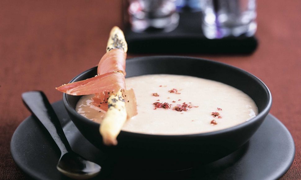 Un délicieux velouté de haricots tarbais, servi avec de fines tranches de lard fumé.La pointe de piment d'Espelette qui rehausse les saveurs.