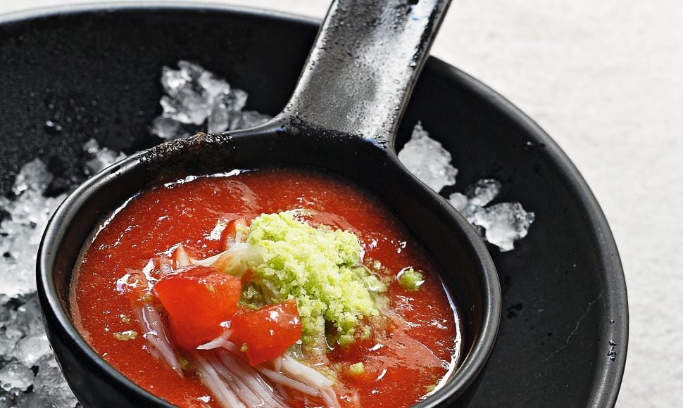 La soupe glacée de tomates est très simple à réaliser. Elle est assaisonnée par du Tabasco, à utiliser selon vos goûts et de ketchup maison. Le granité au basilic apporte un peu de croquant et surtout de la fraîcheur à votre soupe. Un peu de chair du crabe pour la touche finale et vous n'avez plus qu'à déguster.