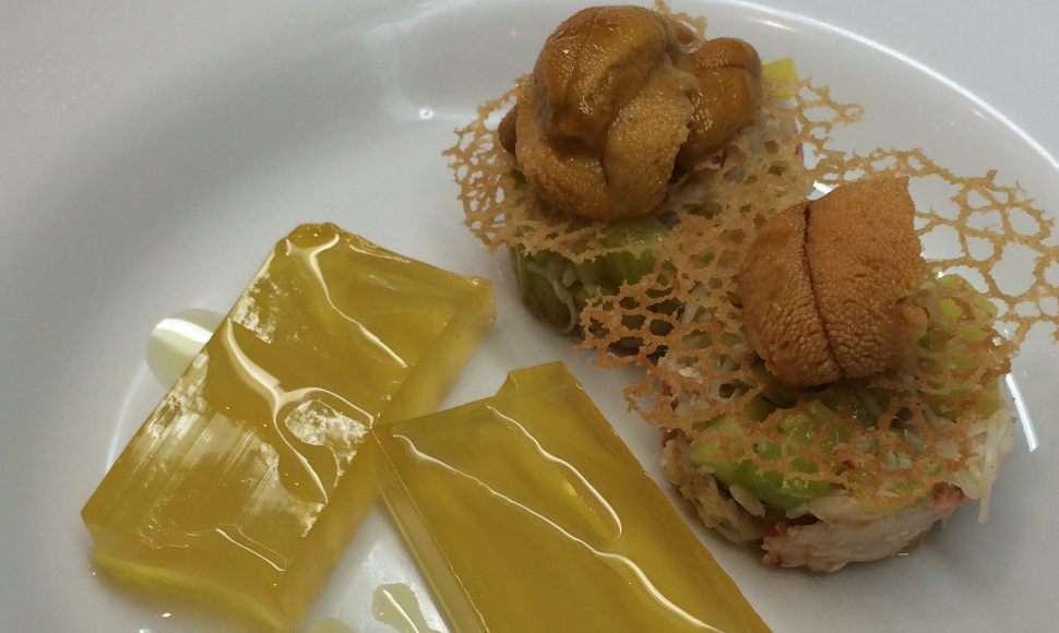 Soupe froide de courgette, gelée de poisson, oursin et kegani