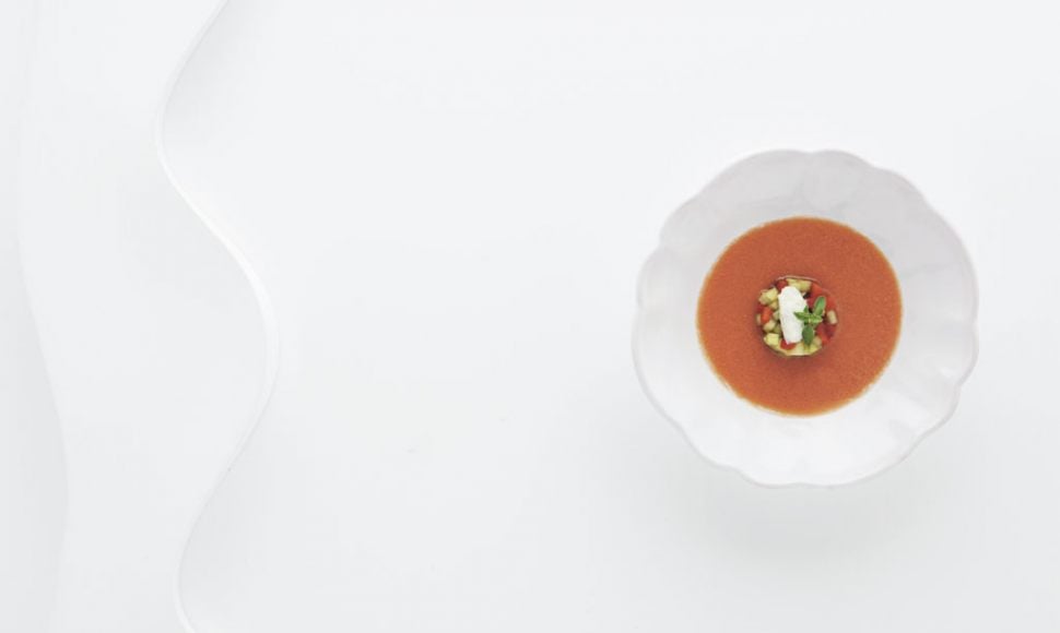 Soupe glacée de tomates du potager, basilic et caillé de chèvre