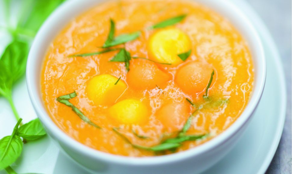 Épluchez la mangue et coupez-la en morceaux. Videz les melons et prélevez la chair du melon entier. Mettez-la ainsi que la mangue dans la cuve d'un mixeur. Pressez le citron vert. Lavez le basilic et effeuillez-le.