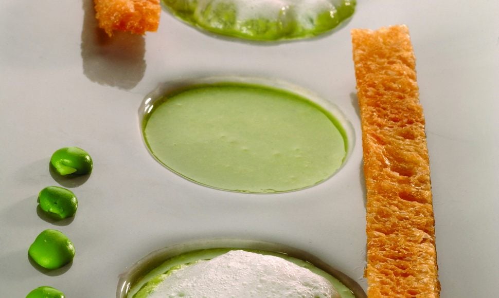 Écosser les petits pois. Les réserver. Trier 100 g de cosses parmi les plus fines. Les effiler et les laver. Chauffer le fond blanc de volaille. Quand il bout, y jeter les cosses. Attendre la nouvelle ébullition et retirer la casserole du feu. Laisser infuser pendant 20 minutes. Filtrer ce fond aromatisé dans un chinois étamine. Le remettre à chauffer. Dans une casserole, chauffer un filet d’huile d’olive. Y déposer les petits pois. Les faire suer pendant 2 minutes. Saler avec de la fleur de sel. Prélever quatre c. à s. de petits pois, les réserver. Verser le fond blanc aromatisé bouillant sur le reste des petits pois. Ajouter le beurre coupé en morceaux et le sucre. Cuire 2 minutes à partir de la reprise de l’ébullition. Mixer les petits pois avec leur bouillon jusqu’à ce que le mélange soit en une très fine purée. La passer au chinois étamine en fouettant bien. Réserver au réfrigérateur.