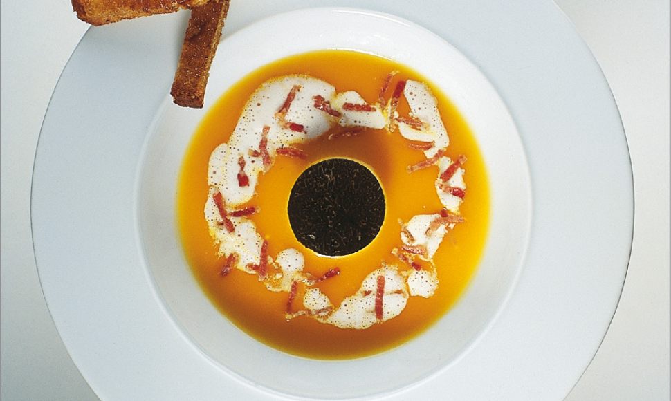 Soupe passée de potiron, petite royale de foies de poularde truffée et lardons croustillants, mouillettes aux sucs de rôti