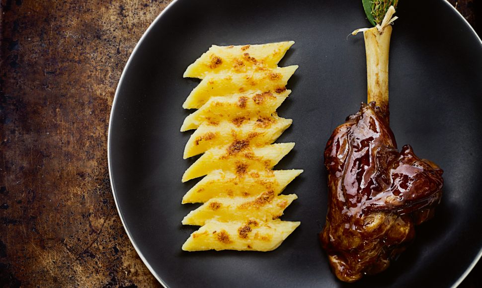 "Dans l’agneau, que préférez-vous ? La souris ! Ce morceau, qui joue les individualistes, possède sa propre consistance, sa propre saveur et, accroché tout entier à l’os, maintient une distance respectueuse avec le gigot proprement dit. C’est le morceau le plus savoureux en raison de son équilibre entre goût et consistance. Sa taille et son unité le distinguent et, pour moi, il est l’adaptation d’une grande pièce de viande en portion individuelle. Pourquoi le servir avec un gratin de macaroni ? Parce qu’après avoir longtemps hésité avec un gratin dauphinois… j’ai tiré à pile ou face !"