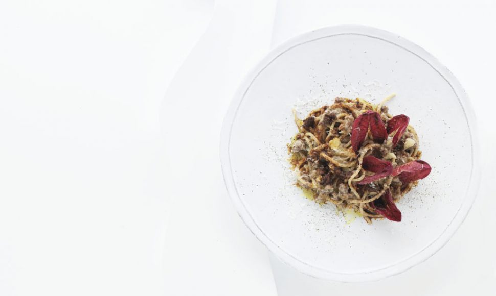 Spaghetti à la guitare, saucisse, trévise, ricotta et pecorino