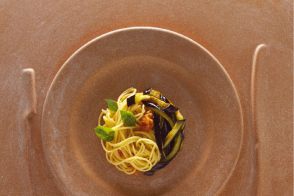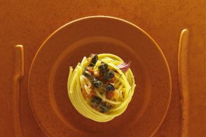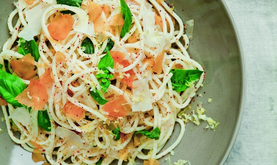 Retirer la cire et la membrane d’une demi-poutargue. Puis, avec un couteau économe ou à la mandoline, la tailler en copeaux. Réserver dans une assiette. Râper le zeste d’un citron non traité dessus. Presser le jus de ce fruit et réserver. Peler et hacher les gousses d’ail rose. Rincer, sécher, effeuiller un demi-bouquet de basilic. Ciseler toutes les grosses feuilles et garder les petites entières. Réserver.