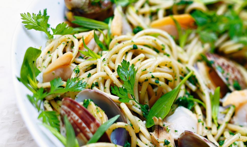 Plonger les spaghettis dans une casserole d’eau bouillante salée et les cuire. Al dente. Pendant la cuisson des spaghettis, chauffer un sautoir avec un filet d’huile d’olive et faire suer l’échalote. Ajouter l’ail et les tiges d’herbes, bien mélanger. Mettre alors les palourdes, les remuer puis verser le vin blanc.
