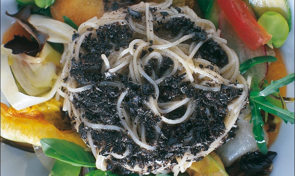 Spaghettini al dente, de la truffe noire écrasée pour les lier, légumes sautés au moment