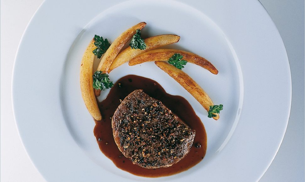 Steak de filet de bœuf de chalosse poêlé en croûte et sauce au poivre, grosses frites à la graisse d’oie, salade de cœurs de laitue