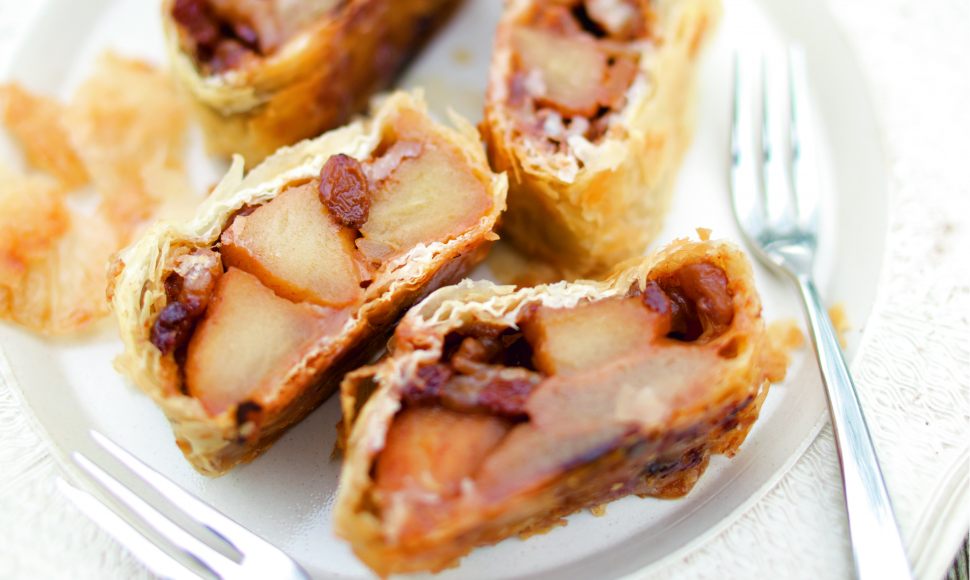 Épluchez les pommes, coupez-les en quartiers, puis chaque quartier en dix morceaux. Faites-les dorer avec le sucre roux, le beurre demi-sel, les noix et les raisins secs égouttés dans une grande poêle sur feu vif pendant 5 à 7 min. À la fin de la cuisson, les pommes ne doivent plus rendre de jus. Saupoudrez de cannelle et laissez refroidir.