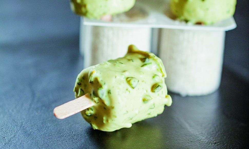 Une sucette glacée à la pistache et à l'amande avec un enrobage au chocolat blanc : une réinterprétation de la spécialité indienne : le kulfi.