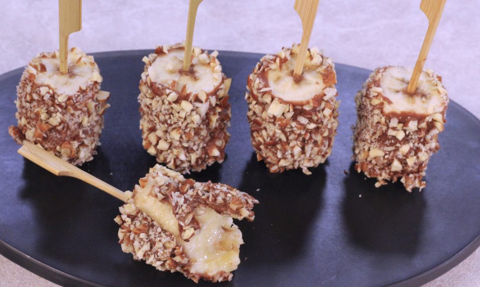 Pour un en-cas ou un goûter ludique mais peu calorique, optez pour ces sucettes à croquer où des morceaux de banane se retrouvent enrobés de chocolat et de brisures de noisette.