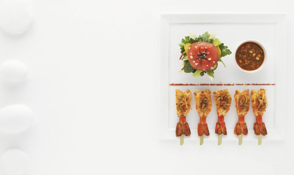 Sucettes de camaron en chermoula, sauce tamarin croquante, tomate/wok