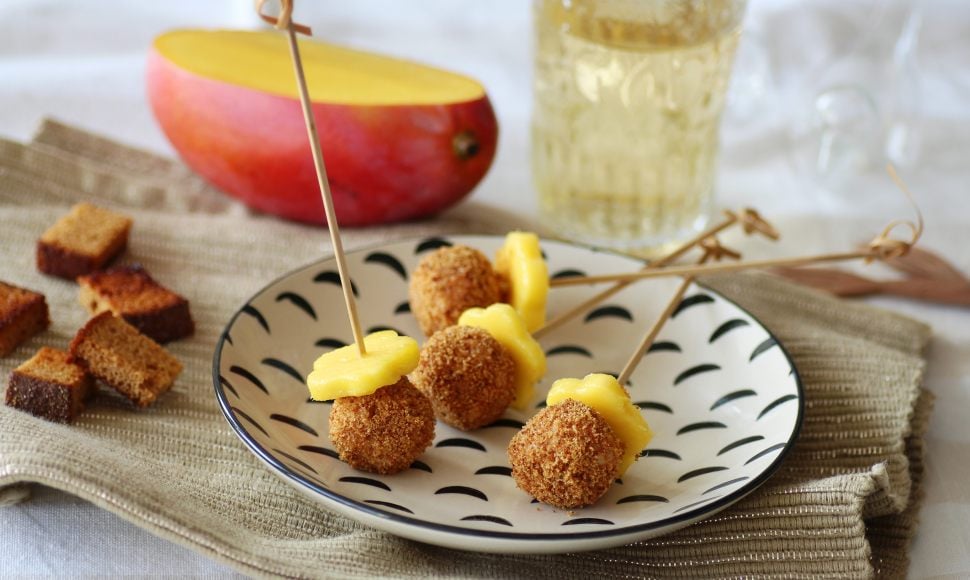 Enfiler des morceaux de mangues et les billes de foie gras sur des piques en bois. Servir sans attendre.