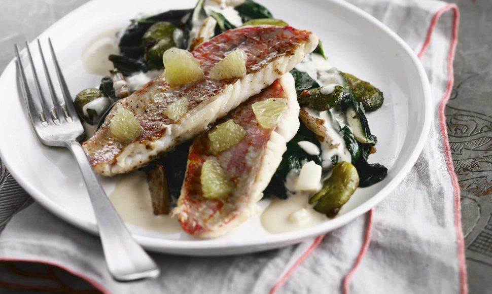 Dégustez un délicieux rouget cuit au four avec une sauce à base de blettes, de tahine et citron jaune.