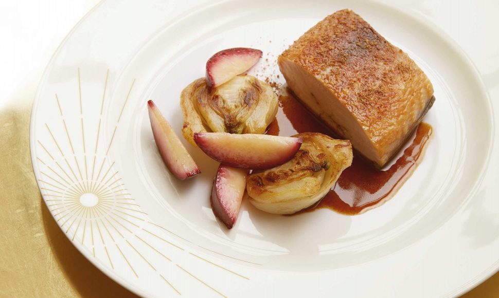 Suprême de pintade fermière aux pêches de vigne, fenouil fondant