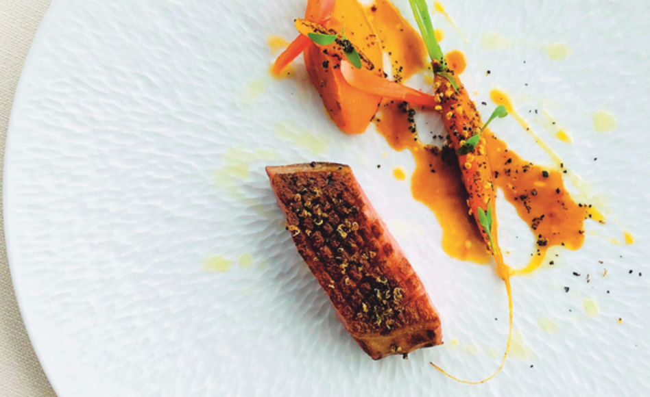 Suprême rôti, mousseline de carotte, vinaigrette au pollen, jus de canard